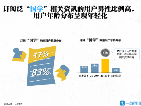 金治指出,這些數(shù)據(jù)來源于對關注“國學”相關頻道的訂閱用戶。通過對群體性別、年齡階段、所處地域等維度數(shù)據(jù)進行精準分析,進而得出這樣一個權威報告。鳳凰網(wǎng)聯(lián)合一點資訊舉辦此次研討會的初衷,就是希望通過科技手段為傳播國學貢獻力量,為用戶帶來更具實用性和價值性內容。
