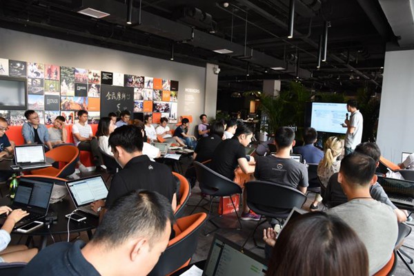 摩拜單車總部咖啡館內(nèi)的員工會(huì)議