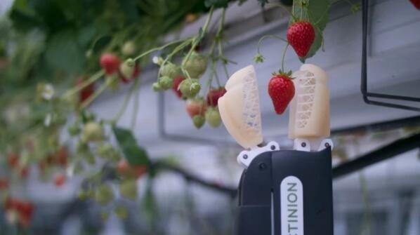 在比利時(shí)的一間溫室中,有臺(tái)小型機(jī)器人,它穿過生長在支架托盤上的一排排草莓,利用機(jī)器視覺尋找成熟完好的果實(shí),然后用3D打印的爪子把每一顆果實(shí)輕輕摘下,放在籃子里以待出售。如果感覺果實(shí)還未到采摘的時(shí)候,這個(gè)小家伙會(huì)預(yù)估其成熟的時(shí)間,然后重新過來采摘。