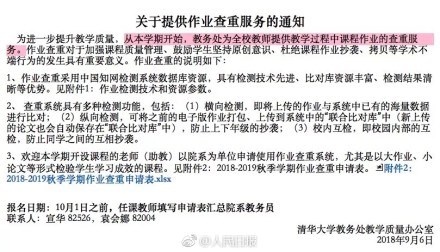 隨著各大高校紛紛迎來開學(xué)季,一些高校的教務(wù)系統(tǒng)也填了新“設(shè)備”。近日,記者從清華大學(xué)官網(wǎng)了解到,從今年秋季學(xué)期開始,清華大學(xué)將為全校教師提供教學(xué)過程中課程作業(yè)的查重服務(wù),系全國首個對學(xué)生課程作業(yè)查重的高校。