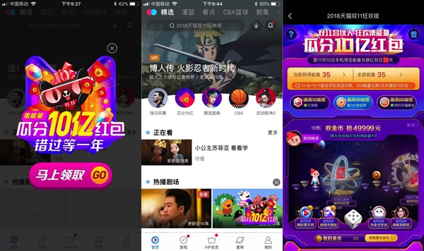 距11月10日能量兌換紅包還剩下19天。隨著雙11狂歡節(jié)全球啟幕,優(yōu)酷全面接入天貓“雙11合伙人 狂歡集能量”,開啟“雙11狂歡夜”主會場。