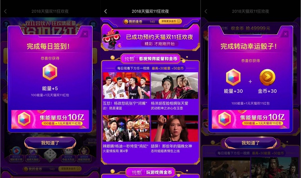 以優(yōu)酷為主的阿里大文娛是阿里經(jīng)濟(jì)體重要的用戶平臺,參戰(zhàn)雙11與天貓形成深度協(xié)同。在“雙11合伙人”計劃中,打開優(yōu)酷進(jìn)入“2018天貓雙11狂歡夜”主會場,參與游戲活動即可持續(xù)積累多種福利。