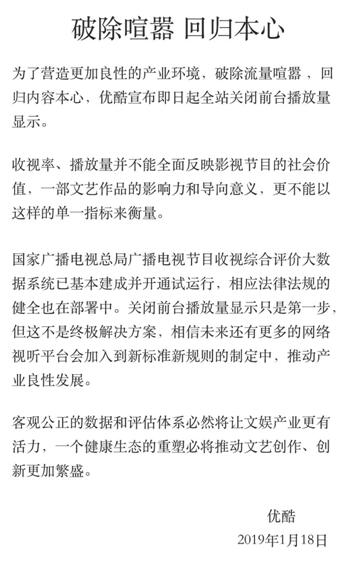 “收視率、播放量并不能全面反映影視節(jié)目的社會(huì)價(jià)值,一部文藝作品的影響力和導(dǎo)向意義,更不能以這樣一個(gè)簡(jiǎn)單的指標(biāo)來(lái)衡量!蓖瑫r(shí)優(yōu)酷也表示,關(guān)閉前臺(tái)播放量顯示只是第一步,但這不是終極解決方案,相信未來(lái)還有更多的網(wǎng)絡(luò)視聽(tīng)平臺(tái)會(huì)加入到新標(biāo)準(zhǔn)新規(guī)則的制定中,推動(dòng)產(chǎn)業(yè)良性發(fā)展。