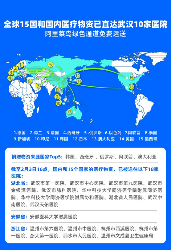 1月25日,阿里巴巴設(shè)立10億元醫(yī)療物資供給專項基金,雙管齊下:將集團在海內(nèi)外采購,和海內(nèi)外企業(yè)、團體和個人捐贈的大量醫(yī)療物資,通過阿里公益及菜鳥綠色通道直送國內(nèi)疫區(qū)醫(yī)院。