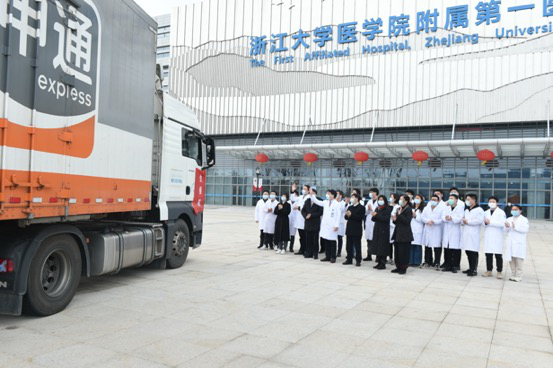 浙大第一醫(yī)院的醫(yī)護人員列隊,送別連夜辛苦送貨的申通卡車司機。