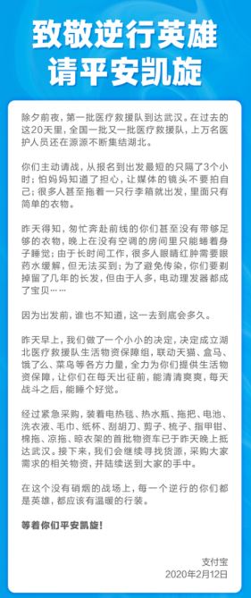 支付寶2月12日宣布,已經(jīng)成立湖北醫(yī)療救援隊生活物資保障組,聯(lián)動阿里經(jīng)濟(jì)體內(nèi)的淘寶、天貓超市、口碑、餓了么等各方力量進(jìn)行采購和配送,為援鄂醫(yī)療隊解決生活物資緊缺問題,重點保障保暖和生活必需品兩類物資。