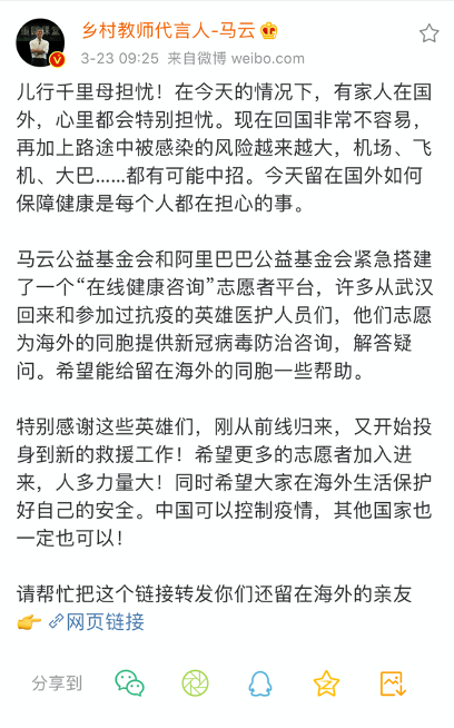 今天上午,馬云在微博上再次發(fā)聲,請(qǐng)求并呼吁參與過一線抗“疫”的英雄醫(yī)生們加入到對(duì)海外華人的在線新冠病毒防治咨詢志愿服務(wù)中來,幫助千萬身處海外的華人渡過難關(guān)。