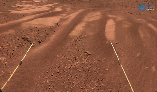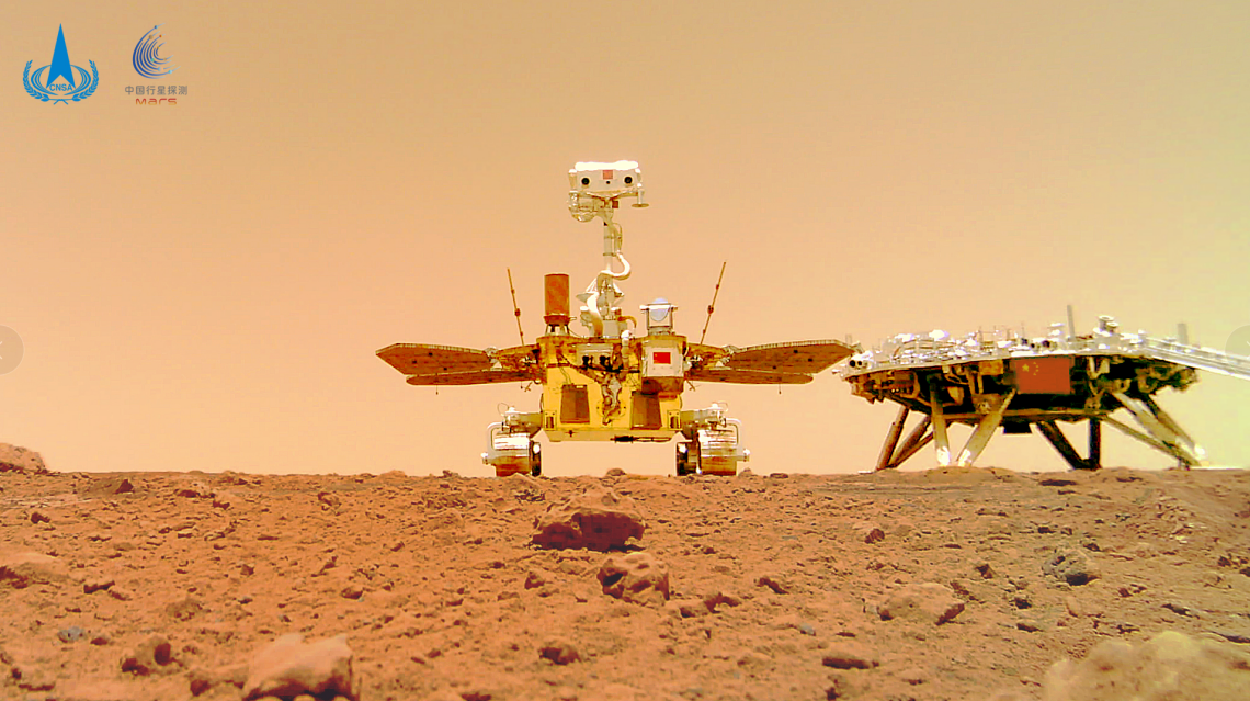 2021年5月22日10時(shí)40分,“祝融號(hào)”火星車駛達(dá)火星表面,開始在軌測(cè)試和巡視探測(cè),先后傳回“著陸點(diǎn)全景”、“地形地貌”、“中國印跡”和“著巡合影”等影像圖。