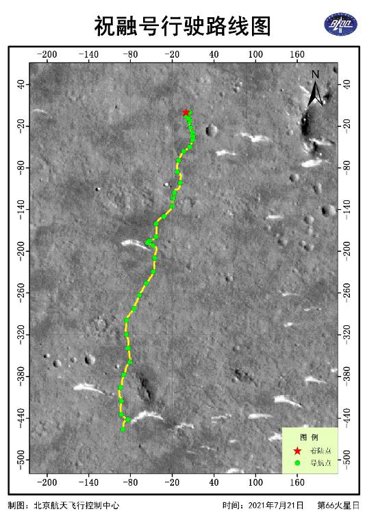 開始科學(xué)探測(cè)以來,“祝融號(hào)”火星車從著陸點(diǎn)向南部古海陸交界方向行駛,行駛路線如下圖(北京航天飛行控制中心制作)。