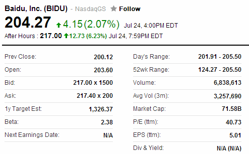 今天凌晨,百度發(fā)布了截至6月30日的2014財年第二季度未經(jīng)審計財報。報告顯示,百度第二季度總營收為人民幣119.86億元(約合19.32億美元),同比增長58.5%;第二季度凈利潤為人民幣35.47億元(約合5.717億美元),同比增長34.1%。百度第二季度業(yè)績超出華爾街分析師預(yù)期,推動百度股價在納斯達(dá)克常規(guī)交易中上漲4.15美元,報收于204.27美元,漲幅為2.07%。在隨后截至美國東部時間16:56(北京時間4:56)為止的盤后交易中,百度股價再度上漲14.19美元,至218.46美元,漲幅近7%。目前公司市值已達(dá)到714.54億美元。