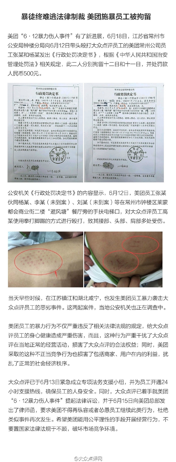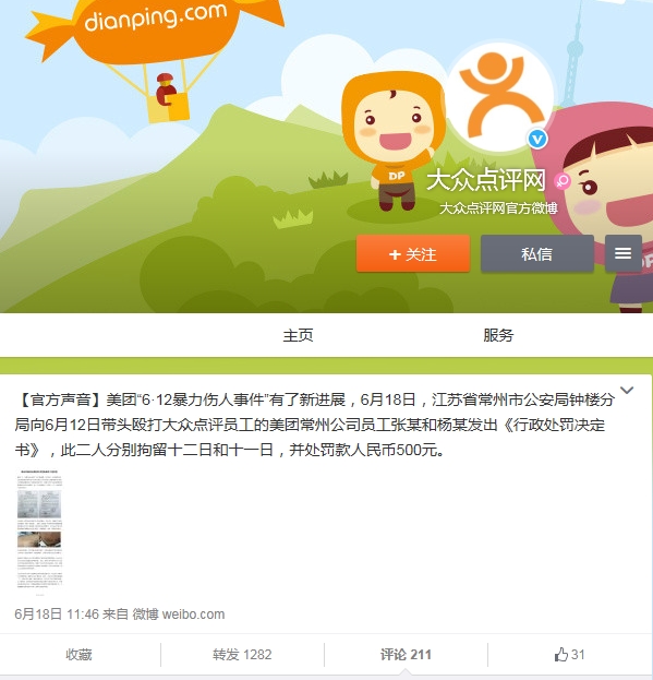 6月18日,大眾點(diǎn)評(píng)通過公布了6月12日三起員工被打事件的新進(jìn)展。微博展示了江蘇省常州市公安局鐘樓分局向6月12日帶頭毆打大眾點(diǎn)評(píng)員工的美團(tuán)常州公司員工張某和楊某發(fā)出《行政處罰決定書》,根據(jù)《中華人民共和國治安管理處罰法》相關(guān)規(guī)定,此二人分別拘留12日和11日,并處罰款人民幣500元。