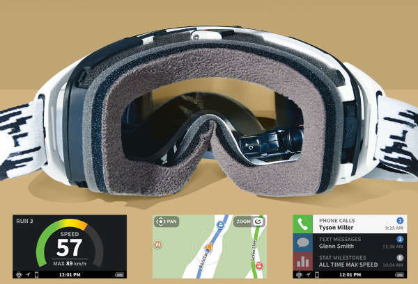 他們的首款產(chǎn)品Recon Snow是為滑雪愛好者設(shè)計的頭戴顯示設(shè)備。從外面看和普通的滑雪裝備沒什么不同,但是眼鏡下面的紅點是一個小型的顯示器,由一個簡單的遙控器控制。主屏幕能夠顯示速度、海拔和縱向位移速度,內(nèi)置的GPS能夠在地圖上提供導(dǎo)航功能,還有帶拍照功能的app。通過藍牙傳輸,與一臺智能手機連接,滑雪者可以播放音樂、接打電話、閱讀文字消息獲取系統(tǒng)通知推送。