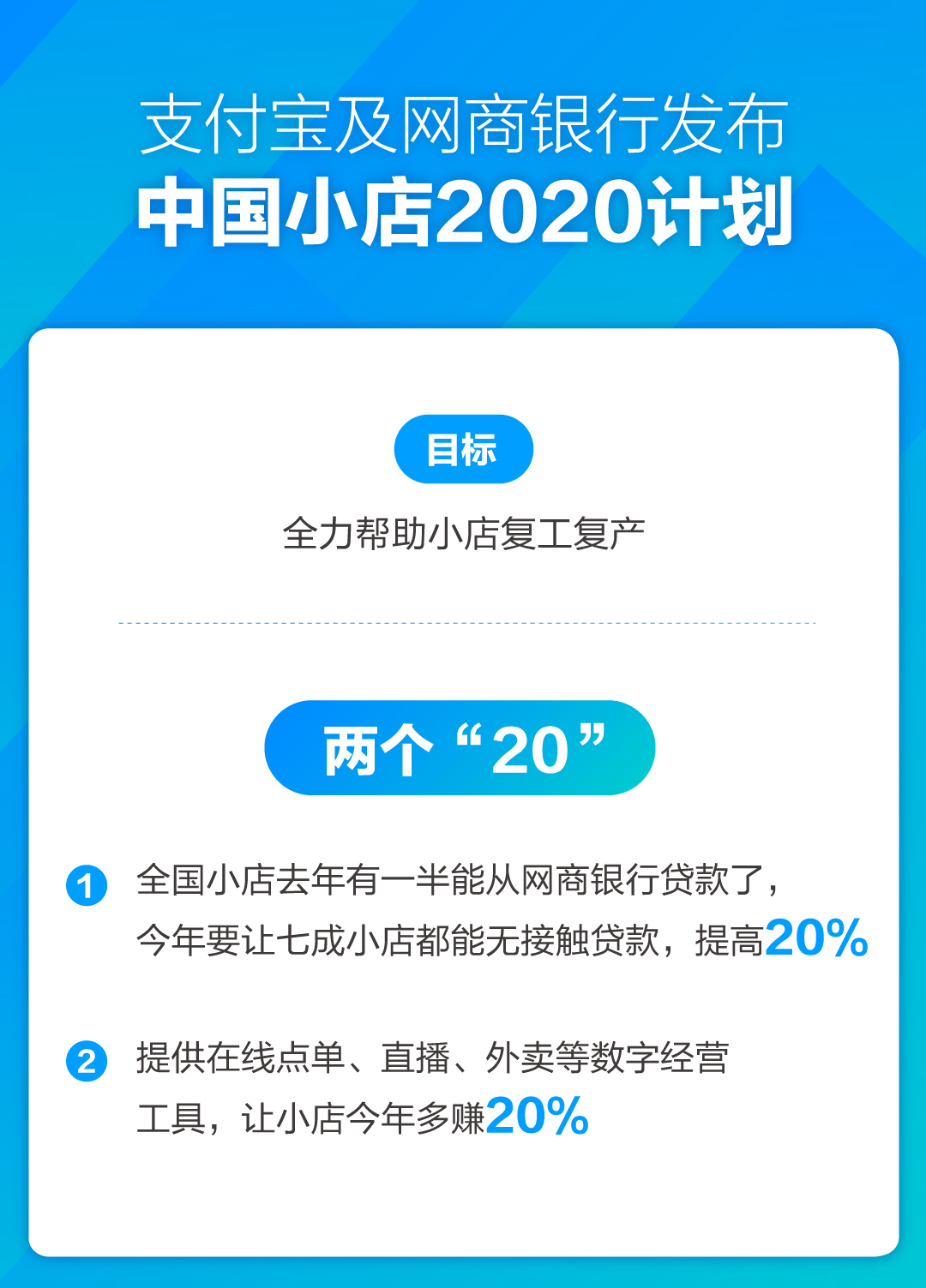 3月19日,支付寶聯(lián)合網(wǎng)商銀行發(fā)布小店2020計劃,這個計劃有兩個目標(biāo),貸款可獲得率提升20%,數(shù)字化收入提升20%。前者針對本錢問題,后者針對賺錢問題,從而促進(jìn)小店經(jīng)濟(jì)持續(xù)回暖,為“煙火氣”護(hù)航。