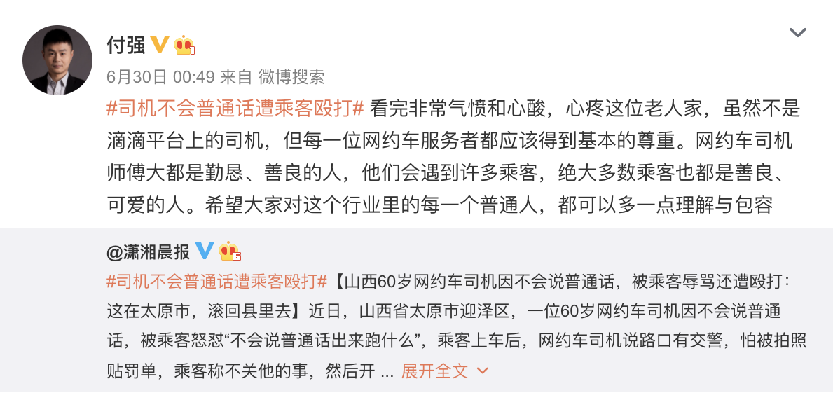 隨后滴滴網(wǎng)約車CEO付強(qiáng)發(fā)微博稱:“看完非常氣憤和心酸,心疼這位老人家,雖然不是滴滴平臺(tái)上的司機(jī),但每一位網(wǎng)約車服務(wù)者都應(yīng)該得到基本的尊重。網(wǎng)約車司機(jī)師傅大都是勤懇、善良的人,他們會(huì)遇到許多乘客,絕大多數(shù)乘客也都是善良、可愛的人。希望大家對(duì)這個(gè)行業(yè)里的每一個(gè)普通人,都可以多一點(diǎn)理解與包容。”