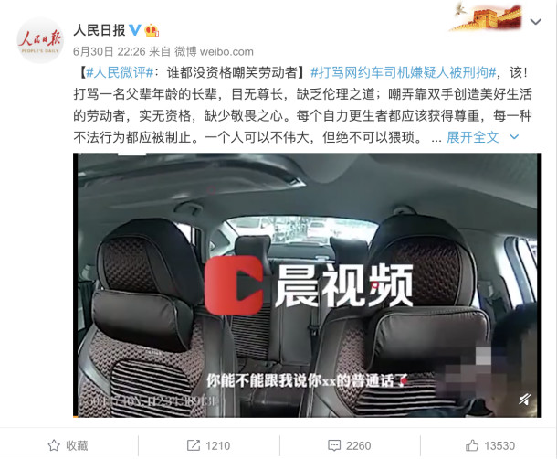 人民日?qǐng)?bào)微博就此事發(fā)表人民微評(píng)“誰(shuí)都沒資格嘲笑勞動(dòng)者。該!打罵一名父輩年齡的長(zhǎng)輩,目無(wú)尊長(zhǎng),缺乏倫理之道;嘲弄靠雙手創(chuàng)造美好生活的勞動(dòng)者,實(shí)無(wú)資格,缺少敬畏之心。每個(gè)自力更生者都應(yīng)該獲得尊重,每一種不法行為都應(yīng)被制止。一個(gè)人可以不偉大,但絕不可以猥瑣!