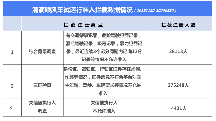 其次,為保證乘客乘車安全,滴滴順風車進一步提高準入門檻。報告顯示,試運行期間,滴滴順風車駁回不符合新認證要求(綜合背景審核、失信人篩查、三證驗真)的車主317792人,對824名代刷臉及使用作弊工具的用戶永久暫停服務(wù)。