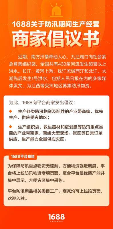 7月14日,阿里巴巴B2B事業(yè)群緊急啟動預案,發(fā)動1688、零售通等事業(yè)部通過籌集防汛救災物資、開通緊需物資綠色通道、為受災商家提供金融支持等方式,參與防汛救災。