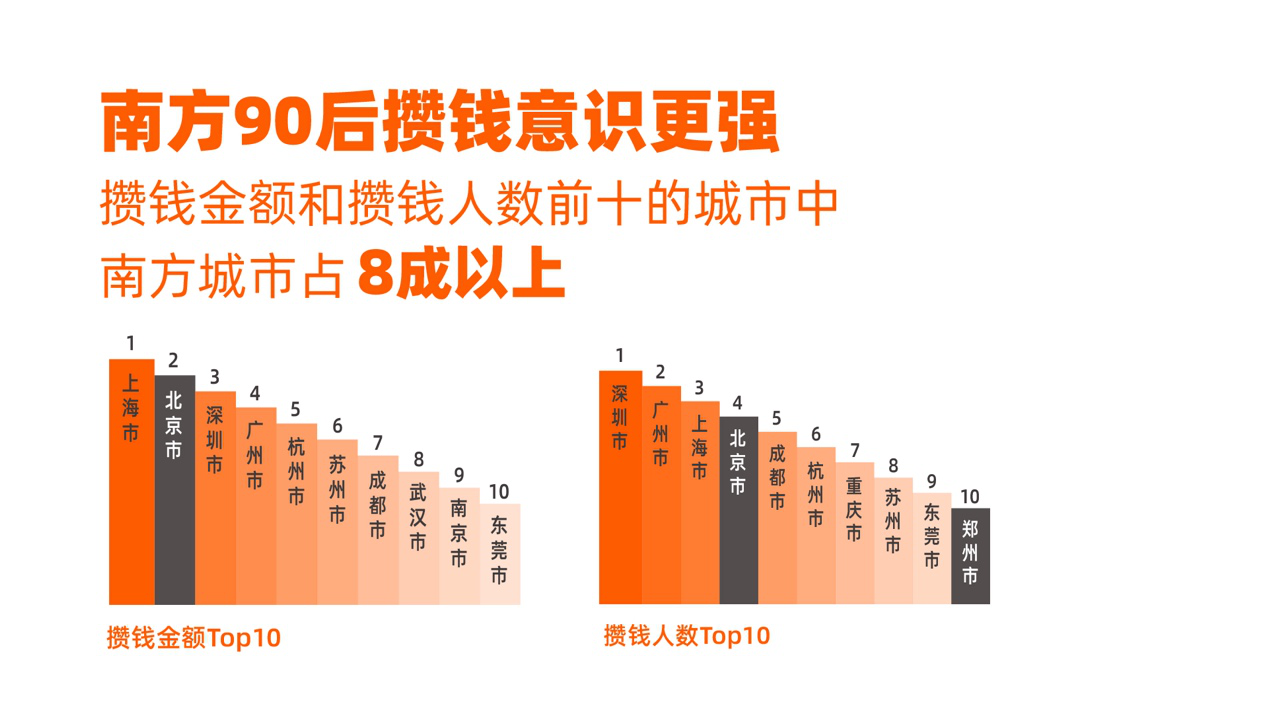 南方人精打細(xì)算的品質(zhì)也反映到了攢錢上。報(bào)告顯示,90后攢錢金額和攢錢人數(shù)前十的城市中,南方城市占8成以上,南方90后攢錢意識(shí)更強(qiáng)。