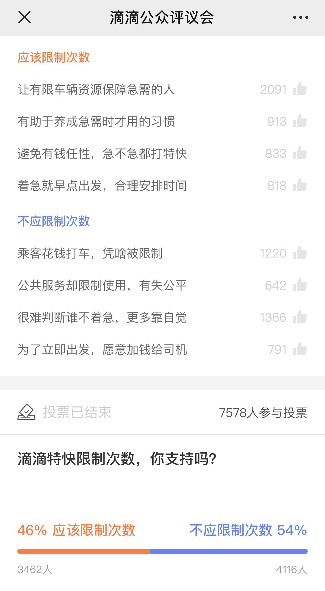 此前,滴滴推出公眾評議會第14期,針對“滴滴特快是否限制次數(shù)”向社會公眾征集意見。投票結(jié)果顯示, 54%的用戶不支持限制使用次數(shù)。因此,滴滴特快在試運(yùn)營期間,暫不限制使用次數(shù),未來將根據(jù)用戶使用情況和反饋實(shí)時調(diào)整。