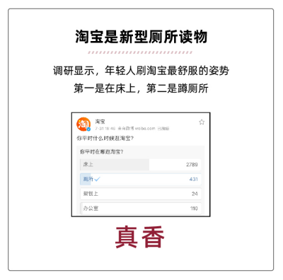 在淘寶官微發(fā)起的投票中,網(wǎng)友們最愛刷淘寶的地方,第一名是床上,第二名是廁所。網(wǎng)友紛紛表示:凌晨2點,擺脫了所有的工作留言,刷會淘寶才會覺得這一天還給自己留了一些事件。