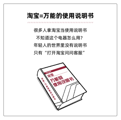 淘寶的出現(xiàn),以及客服的完善,讓年輕人不再有留著說明書的理由。數(shù)據(jù)遇到不會用的設(shè)備,打開淘寶問客服就好了;給爸媽買的電器怎么用,打開淘寶看視頻教程……當然了,就算不是在淘寶上買的,也可以在淘寶上搜到并找到答案。