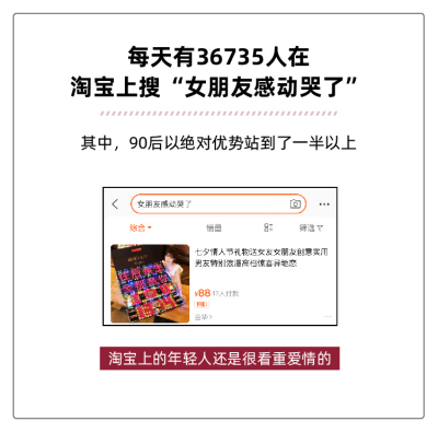 淘寶上的年輕人始終相信愛情。每天都會有36735人在淘寶上搜“感動哭了”,目的是為了給女朋友買禮物。只是這個詞下面搜出來的東西,確實令人想哭。也許溝通中會有詞不達意的時候,但在淘寶上為你搜的每一個詞,都是愛的表現(xiàn)。