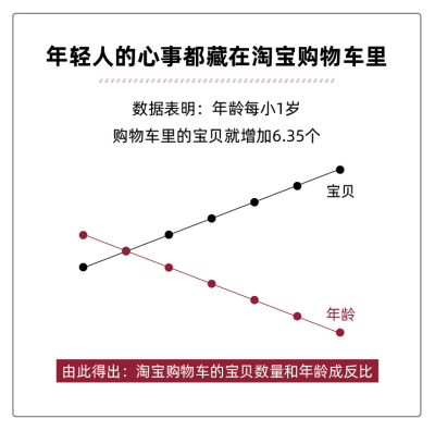 年輕人的心事都藏在了淘寶購物車里。數(shù)據(jù)表明,年齡每小1歲,淘寶購物車里的寶貝就會增加6.35個。年輕的時候總有很多夢想,購物車里裝著的是未來的藍圖。