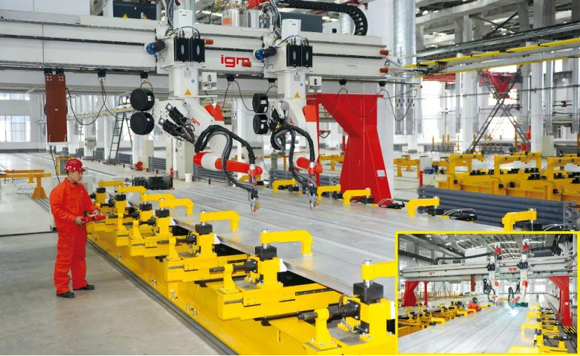 在忠旺集團(tuán)軌道車體制造車間,工人正在用自動焊接機(jī)進(jìn)行高鐵地板焊接操作。(忠旺供圖 央廣網(wǎng)發(fā))