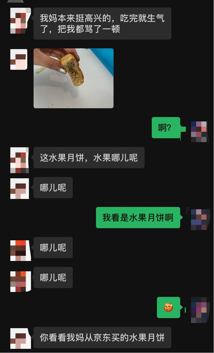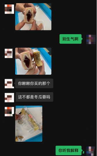 “當時吃完晚飯,就想著把我男朋友送的月餅?zāi)贸鰜斫o爸媽嘗嘗,可是越吃口感越不對!毙∶舾嬖V記者,當時那盒月餅里標注著各種水果餡,比如蔓越莓、鳳梨等,可是吃起來發(fā)現(xiàn)味道全一樣。后來,小敏的媽媽拿起包裝配料表才恍然大悟,原來這些水果月餅的配料全是冬瓜蓉!拔覌尞敃r就有點兒不高興了,但是又覺得可能現(xiàn)在水果月餅是不是都這樣,就當天晚上自己在京東上買了一盒水果月餅,后來第二天送到后一咬開發(fā)現(xiàn),確實是有果肉的,而且配料表上寫的也不是冬瓜蓉!边@一對比之下,小敏媽媽火冒三丈。“我媽覺得小劉還沒結(jié)婚就用劣質(zhì)月餅糊弄家長,這種人不靠譜,必須讓我跟他分手,還說以后再也別跟他見面了!毙∶魺o奈地告訴記者。