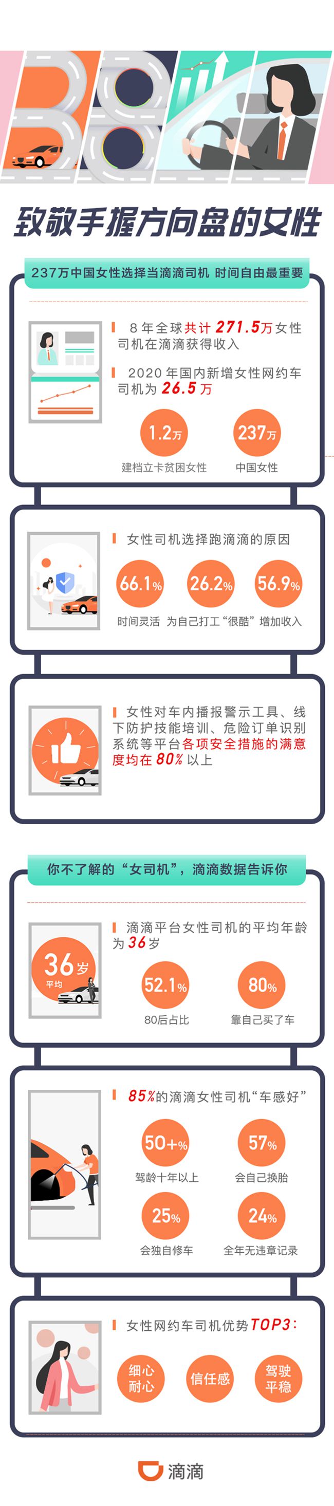 近日,滴滴發(fā)布《2021向上的力量-滴滴數(shù)字平臺(tái)與女性生態(tài)研究報(bào)告》,報(bào)告指出女性選擇開(kāi)網(wǎng)約車(chē),主要原因的是時(shí)間自由,其中66.1%的女性認(rèn)為“網(wǎng)約車(chē)自由度高,可以自己掌握時(shí)間”、56.9%的女性認(rèn)為網(wǎng)約車(chē)幫助她們“增加收入”,更有26.2%的女性認(rèn)為這種“自己給自己打工的工作模式很酷”。