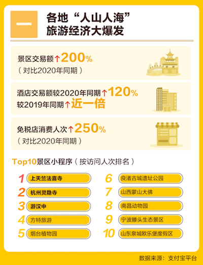 今年五一“人從眾”,出游人次創(chuàng)下歷史新高,火爆的“補償式出游”直接帶動了景區(qū)、酒店、商圈等消費的大幅飆漲。支付寶數(shù)據(jù)顯示,從5月1日到5月3日,全國景區(qū)交易額較2020年同期上漲200%,酒店交易不僅較去年同期增長120%,甚至比2019年同期還要上漲近一倍。各大商圈的客流也迎來客流高峰,全國免稅店消費人次總體上升近250%。