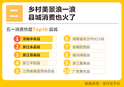 節(jié)慶出游除了網(wǎng)紅城市,鄉(xiāng)村美景也備受青睞,縣域消費同樣火熱。支付寶數(shù)據(jù)顯示,河南中牟縣、浙江永嘉縣、浙江蒼南縣、浙江平陽縣、江西南昌縣、湖南長沙縣、安徽肥西縣、福建閩侯縣、浙江嘉善縣、廣東惠東縣,成為了五一期間消費熱度最高的十大縣城。