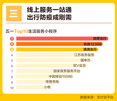 假期出游使得線上服務需求直線上升。通過小程序預約景區(qū)游覽、購票已成為“常規(guī)動作”,上天竺法喜寺、靈隱寺、煙臺植物園、山西蒙山大佛、南昌動物園、寧波滕頭生態(tài)景區(qū)、山東泉城歐樂堡度假區(qū)、游漢中等位列十大人氣景區(qū)小程序。與此同時,出行、防疫和移動充電成“剛需”,相應的共享打車、線上購票、打車、在線政務服務以及充電小程序是最受歡迎生活服務小程序。在堵車、排隊的路上,僅5月1日就有超過200萬人通過支付寶地下室“蹦迪”游戲互動消遣。