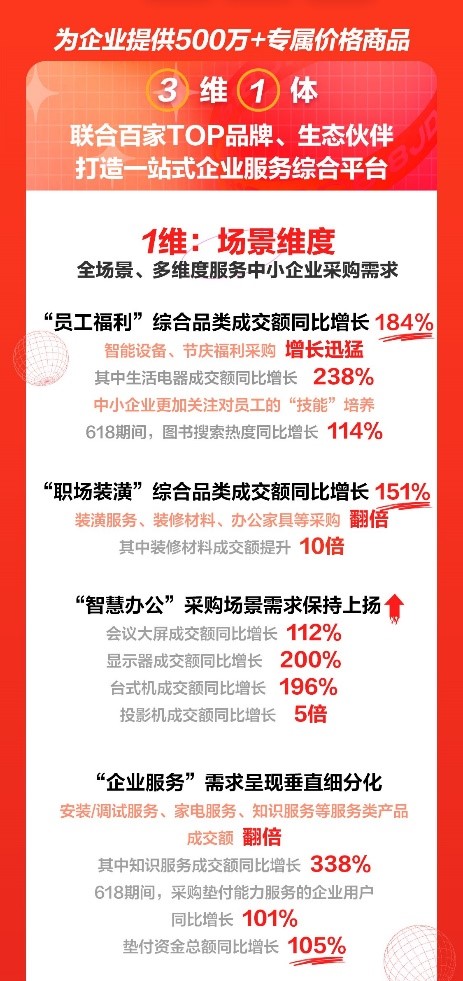 據(jù)京東企業(yè)購數(shù)據(jù),6月1-18日,員工福利綜合品類成交額同比增長184%,其中智能設(shè)備、節(jié)慶福利采購增長迅猛,福臨門、三只松鼠、歐樂B、榮耀、OPPO成為企業(yè)采購員工福利的主要選擇;職場所需生活電器成交額同比增長238%;智慧辦公場景也受到企業(yè)廣泛關(guān)注,會議大屏成交額同比增長112%,顯示器成交額同比增長200%,臺式機成交額同比增長196%,投影儀成交額同比增長5倍,聯(lián)想、ThinkPad、戴爾、惠普、MAXHUB成為備受中小企業(yè)關(guān)注的智慧辦公品牌。而對于職場環(huán)境,企業(yè)也通過裝潢煥新、采購辦公家具等方式為員工創(chuàng)造更舒適的辦公環(huán)境,職場裝潢綜合品類成交額同比增長151%,更多企業(yè)偏好采購美的、海爾、格力、中偉、威克士的產(chǎn)品來提升和改善職場環(huán)境。