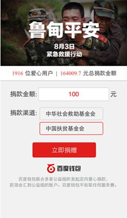 8月3日16時(shí)30分在云南省魯?shù)榭h發(fā)生的6.5級(jí)地震牽動(dòng)著全國億萬人民的心,為了讓社會(huì)各界人士更加方便地為災(zāi)區(qū)獻(xiàn)愛心,手機(jī)百度聯(lián)合百度錢包,在震后第一時(shí)間開通了手機(jī)端捐款通道,用戶可以通過該通道向中華社會(huì)救助基金會(huì)、中國扶貧基金會(huì)捐款。