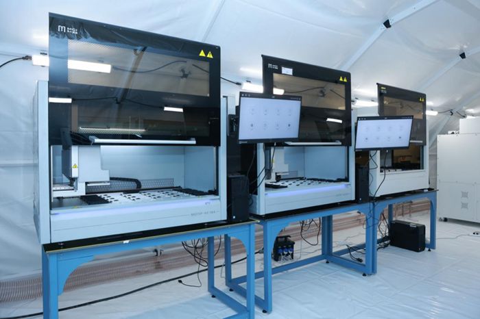實際上,為提升大規(guī)模核酸檢測效率,“火眼”實驗室還搭載了多款華大智造自主研發(fā)的自動化抗疫“黑科技”,使檢測效率較人工操作大大提升。其中,MGISP-NE384全自動核酸提取純化儀能夠有效助力病毒核酸提取,單機日檢測通量高達10000例。MGISTP-7000全自動分杯處理系統(tǒng)可在40分鐘內(nèi)完成192樣本的自動分裝以及信息處理,解決了核酸檢測中最耗費人力和感染風(fēng)險最高的樣本分裝工序工作。MGISP-960高通量自動化病毒核酸提取設(shè)備經(jīng)歷了全球50多個國家的疫情防控驗證。