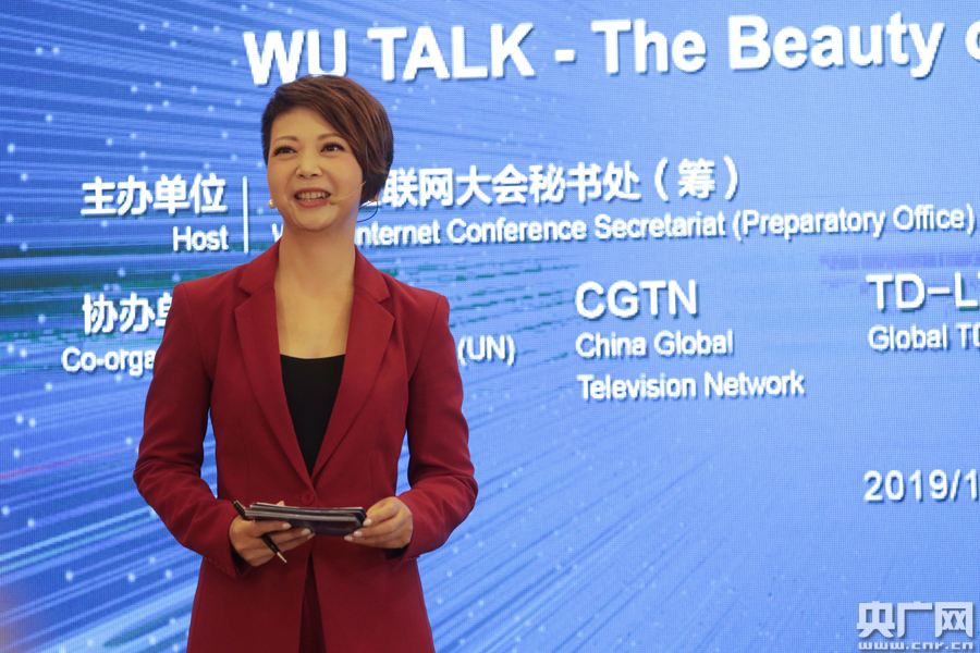 第一場圓桌對話的主題為:面向未來——互聯(lián)網(wǎng)的下一個五十年,圖為來自中央廣播電視總臺CGTN的主持人田薇。