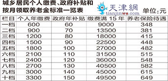 參保居民繳費滿15年的,年滿60周歲時,按照一檔繳費每月可領(lǐng)348元、二檔381元、三檔415元、四檔448元、五檔482元、六檔515元、七檔548元、八檔582元、九檔615元、十檔649元的養(yǎng)老保險待遇。