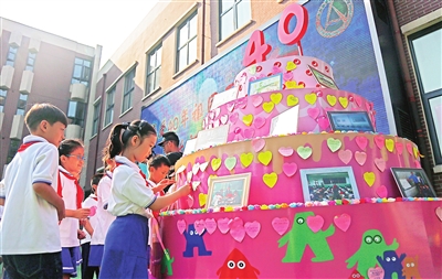 同一時(shí)間,昆明路小學(xué)請(qǐng)來消防和平支隊(duì)的國旗班戰(zhàn)士,為學(xué)生們舉行莊嚴(yán)肅穆的升旗儀式,并邀請(qǐng)家長與孩子們分享自己對(duì)40年來社會(huì)變化的感受。在鞍山道小學(xué)的開學(xué)典禮上,孩子們親手寫下了對(duì)祖國、對(duì)家鄉(xiāng)的真摯祝福,并把一張張心愿卡掛在了師生共同制作的巨大“生日蛋糕”上,最后,校長李慶東為大家送上新學(xué)期寄語:人人爭(zhēng)當(dāng)胸懷祖國、勇往直前、自強(qiáng)不息的新時(shí)代津彩少年,為實(shí)現(xiàn)中華民族偉大復(fù)興的中國夢(mèng)貢獻(xiàn)自己的力量。