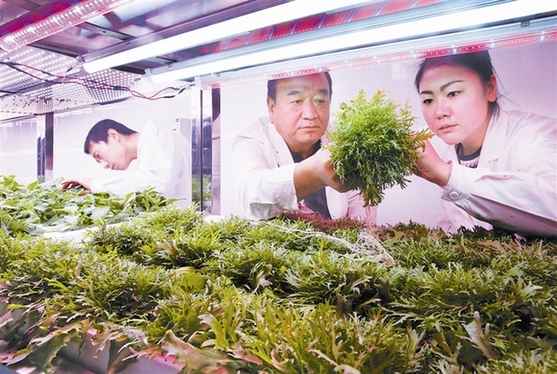 天津市北辰區(qū)青水源蔬菜合作社在農(nóng)技部門指導(dǎo)下引進(jìn)工廠化蔬菜培育項(xiàng)目,采用多層立體水培工藝種植蔬菜,一年四季均可上市。(高瑩輝攝)