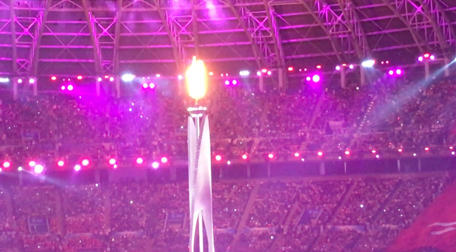 在火炬?zhèn)鬟f環(huán)節(jié),首創(chuàng)將場(chǎng)內(nèi)火炬?zhèn)鬟f延伸進(jìn)觀眾席,火炬所到之處,激發(fā)觀眾手中紅色發(fā)光物燃亮,以“火光帶動(dòng)燈光”在視覺(jué)上形成燈火相映、光芒燃動(dòng)的震撼效應(yīng)。這是一次獨(dú)特的看臺(tái)景觀設(shè)計(jì),造就了一次參與人數(shù)眾多的火炬?zhèn)鬟f,也體現(xiàn)了“全運(yùn)惠民,健康中國(guó)”的主題,采取津娃與智能機(jī)器人攜手點(diǎn)燃圣火的方式,這是傳統(tǒng)與現(xiàn)代的碰撞、是文化與科技的交握,寓意天津?qū)ξ磥?lái)的邀約——以體育的名義,誠(chéng)邀天下;以圣火的光芒,啟動(dòng)未來(lái)。