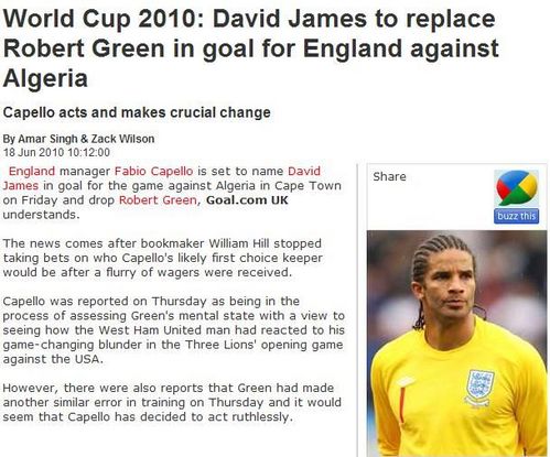 世界著名博彩公司威廉希爾已經(jīng)中止了英格蘭首發(fā)門(mén)將的下注,這意味著卡佩羅已經(jīng)決定讓誰(shuí)擔(dān)任首發(fā)門(mén)將,Goal.com透露,樸茨茅斯老將詹姆斯將在對(duì)阿爾及利亞的比賽擔(dān)任首發(fā)。