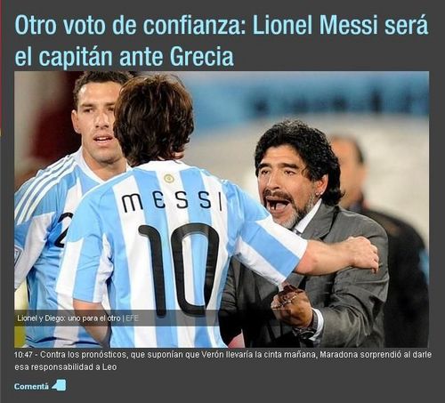 不但梅西確定將會首發(fā),馬拉多納還做出了另一個重要決定,由于下場比賽隊長馬斯切拉諾可能會得到輪休的機會,因此需要另外指定一名場上隊長。對于這個問題老馬也給出了答案,原本大家普遍認(rèn)為老將貝隆帶上隊長袖標(biāo)的可能性較大,但是馬拉多納卻令人意外地選擇了梅西。馬拉多納表示這屆世界杯注定要成為屬于梅西的世界杯,6月24日是梅西23歲的生日,在他生日前夕讓他帶上隊長袖標(biāo),不啻為老馬給梅西送上的一份最好的生日禮物,委實用心良苦。
