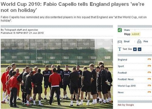 最后一場小組賽,英格蘭將遇到同樣來自歐洲的斯洛文尼亞,后者一勝一平暫居小組首位,如果英格蘭這場再不能取勝,球隊將極有可能被淘汰出局,在展望最后一場比賽時意大利老帥表示,“我們沒有別的選擇了,只有勝利才能確保我們留在南非。”