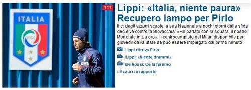 《羅馬體育報(bào)》預(yù)測里皮將在最后一場和斯洛伐克的比賽中作出一些改變,老帥會在加圖索和馬爾基西奧中選擇一人出任中場,基耶利尼可能被移到左路,而卡納瓦羅和博努奇將搭檔中衛(wèi)。鋒線上,吉拉迪諾一直找不到感覺,但里皮無人可用,帕齊尼很難得到機(jī)會,也許夸利亞雷拉能夠制造點(diǎn)驚喜,里皮還有兩天時(shí)間來做出最后決定。