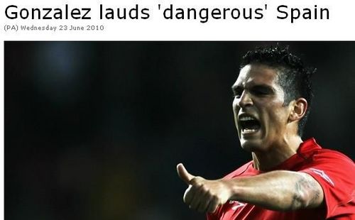 作為智利隊中少數(shù)在西甲聯(lián)賽效力過的球員,岡薩雷斯對于這批西班牙球員有著更深的了解。雖然現(xiàn)在岡薩內(nèi)斯只能屈居于俄超,但在他職業(yè)生涯的早期,他可是個不折不扣的天才邊鋒,利物浦和貝蒂斯都曾為他花費過大筆鈔票。若談西班牙隊,西班牙隊沒有人能比他更有發(fā)言權(quán)。