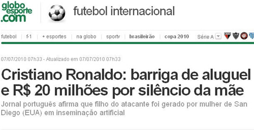 中廣網(wǎng)北京7月8日消息 此前由葡萄牙媒體曝出的C羅代孕生子的消息并非空穴來風(fēng),據(jù)巴西《環(huán)球網(wǎng)》報(bào)道,C羅的一位朋友近日向媒體證實(shí)了這一消息,并稱C羅向那位美國的代孕媽媽支付了一大筆的“封口費(fèi)”,而英國媒體透露這筆錢達(dá)到了1500萬美元,再加上代孕費(fèi),C羅第一個(gè)孩子剛一出生,“身價(jià)”便已經(jīng)達(dá)到了2000萬美元。