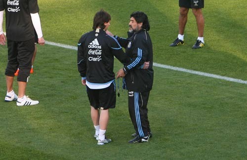 當?shù)貢r間6日下午,馬拉多納率領的阿根廷隊在比勒托利亞大學Hatfield球場進行了公開訓練。進場后,老馬架不住現(xiàn)場球迷的呼喊,兩度獻出飛吻。而在訓練前,馬拉多納專門找到梅西,對他叮囑了幾句。