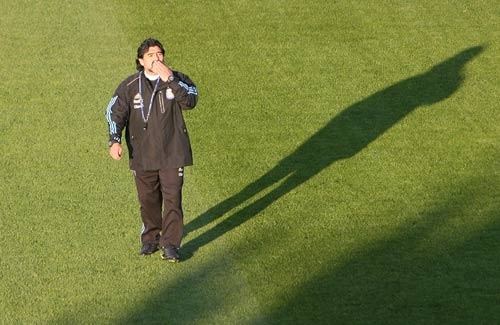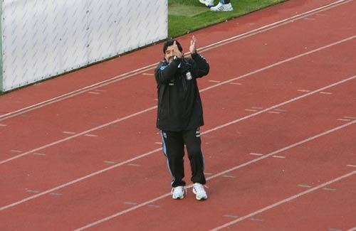 4點15分,馬拉多納走進球場,全場球迷齊聲大喊他的名字,與梅西不同的是,聽到球迷的呼喊,老馬不僅向球迷招手還邊走邊獻上飛吻。隨后,馬拉多納走到梅西面前對他面授機宜,兩人談論了大約半分鐘。之后,老馬將全體隊員召集到中圈進行布置,大約2分鐘后,老馬宣布訓練開始,隊員們進行準備活動。在此過程中,馬拉多納在場邊走來走去,走近看臺時,球迷們再此大喊他的名字,老馬停下來向球迷招手,又一次獻上飛吻。(記者呂長偉)