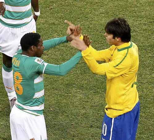 北京時間6月21日,巴西3-1戰(zhàn)勝科特迪瓦,比賽進(jìn)行到第88分鐘,卡卡再次在無球狀態(tài)下碰倒了科特迪瓦球員,你很難說這是一個肘擊動作,現(xiàn)場能看見的就是科特迪瓦球員捂著臉痛苦的倒地?铺氐贤咔騿T立刻沖向了卡卡,卡卡則在第一時間朝后場跑去,盧西奧護(hù)在卡卡面前,更多的巴西球員跑了過來,阻擋科特迪瓦球員的沖擊,現(xiàn)場一片混亂。裁判走向卡卡,掏出第二張黃牌,卡卡紅牌出場。盧西奧憤怒的向裁判表示抗議,羅比尼奧也十分不理解的揮舞著雙手,但一切都已經(jīng)晚了,卡卡搖著頭,微笑著退場。